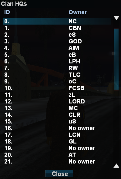 - Această comandă vă arată lista cu toate HQ-urile clanurilor de pe server cât și ID-ul acestora pentru a le putea localiza prin comanda /gps.