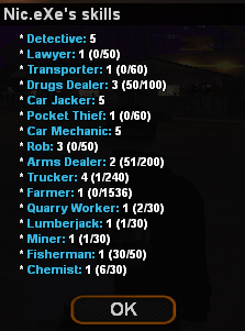 - Afișează skillurile pe care le aveți la joburi și de câte alte puncte mai aveți nevoie pentru a avansa.