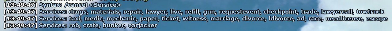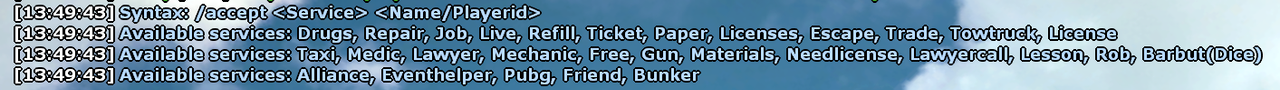 - Puteți accepta unul dintre aceste servicii, dacă vă este oferit de un alt jucător sau de server: droguri (Drugs), reparații (Repair), Job, interviu (Live), aprovizionarea combustibilului (Refill), amendă (Ticket), ziar (Paper), licențe (Licenses), apartenența la un grup de evadare (Escape), negoț (Trade), Taxi, Medic, avocat (Lawyer), mecanic (Mechanic), ieșire din închisoare (Free), armă (Gun), materiale (Materials), cerere /needlicense (Needlicense; pentru Instructori), Lawyercall, Lesson, Rob, Barbut (Dice), Alliance, Eventhelper, Pubg, Friend, Bunker.