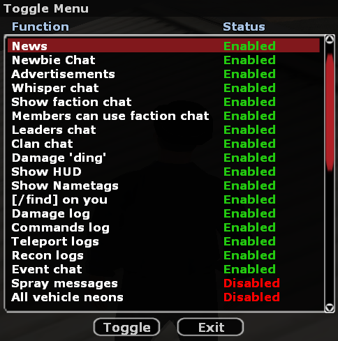 News, Newbie Chat, Advertisments, Whisper Chat, Show Faction Chat, Clan Chat, Damage 'ding', Show HUD, Show Nametags, Event Chat, Spray Messages, Admin Punishments, Confidential Messages, Neons, Surfing, All vehicle neons