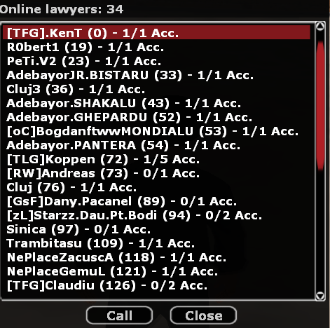 - Afișează o listă cu toți avocații serverului, împreună cu numărul de accept points deținute. Puteți să-i sunați, dând click pe unul dintre ei.